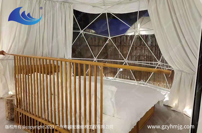 現(xiàn)在我們就看看江西某旅游景區(qū)所搭建的球形帳篷酒店,以半透明為主, 為客群提供高質(zhì)量的帳篷住宿體驗,讓旅客置身自然之中,無時無刻不被大自然的天籟之音和靜謐環(huán)境所包圍。越宏按照需求設(shè)計出一套直徑10米左右的球形帳篷酒店,內(nèi)部配套齊全,有桌椅、睡床、衣柜、沐浴間等等,透明篷布部分設(shè)計是為了更好的觀賞戶外風(fēng)景,以及在夜晚時刻能躺在床上觀望天上星星相伴入睡。帶來有更舒適的睡眠效果。