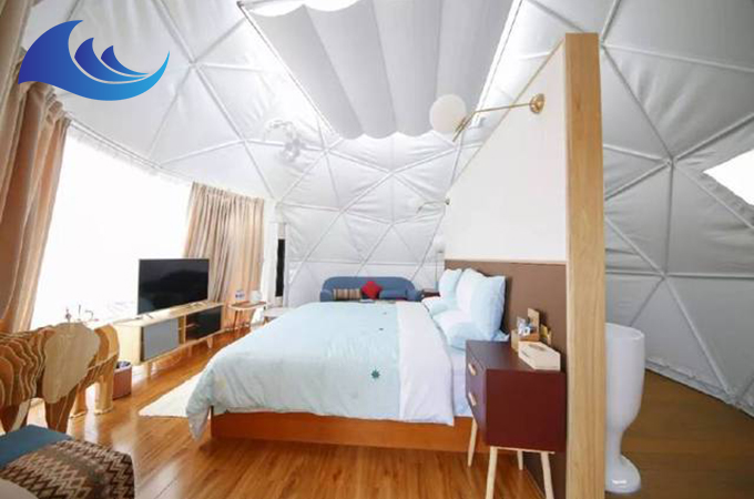 帳篷酒店采用高強度中空鋁合金結(jié)構(gòu)或者是鋼結(jié)構(gòu),表面具備有防腐處理,優(yōu)選膜結(jié)構(gòu)頂棚,安全耐用,防水、阻燃、防紫外線。